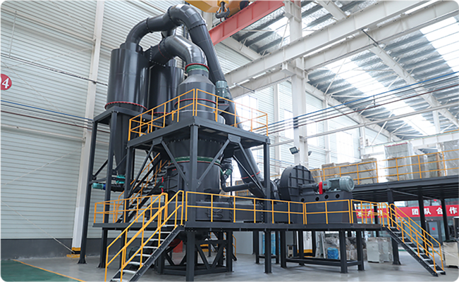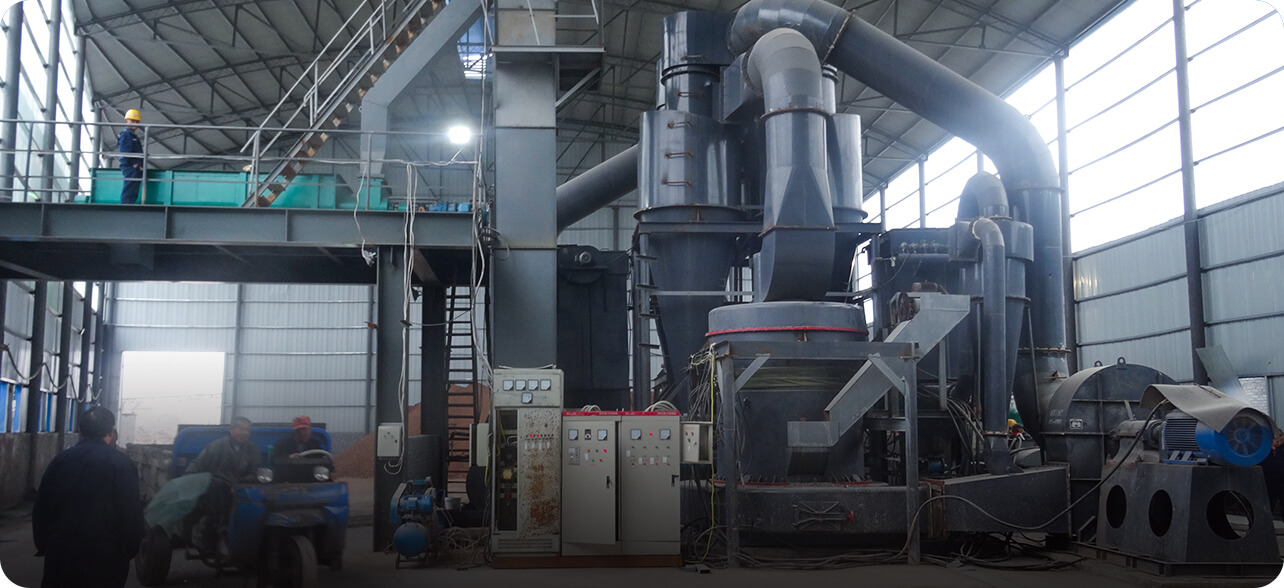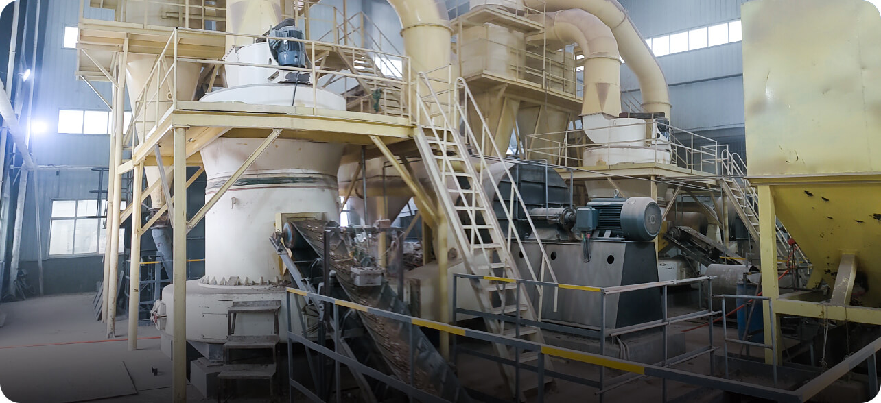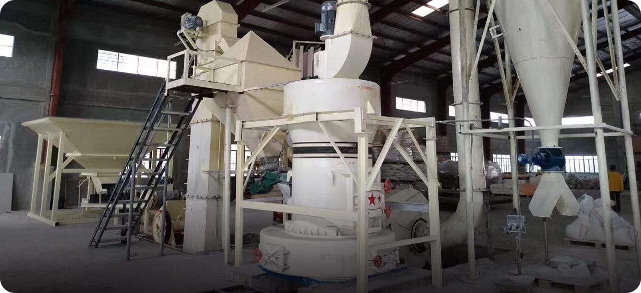 大塊物料進(jìn)入顎式破碎機(jī)后進(jìn)行初級(jí)破碎,然后由斗式提升機(jī)將合適粒度的物料均勻送至儲(chǔ)料倉(cāng)。通過(guò)電磁振動(dòng)給料機(jī)把儲(chǔ)料倉(cāng)的物料均勻、定量、連續(xù)地送到磨粉機(jī)的研磨室內(nèi)進(jìn)行研磨。研磨后的粉末在鼓風(fēng)機(jī)的作用下吹向選粉機(jī)進(jìn)行分選,合格細(xì)粉則由管道送至儲(chǔ)料倉(cāng),分選后的不合格粉料回落繼續(xù)研磨,最后經(jīng)出料閥輸出即為成品粉料。篩分后合格的成品細(xì)粉隨管道裝置進(jìn)入收塵器內(nèi)分離收集,并統(tǒng)一用裝粉罐車打包或送入成品料倉(cāng)內(nèi)即可。