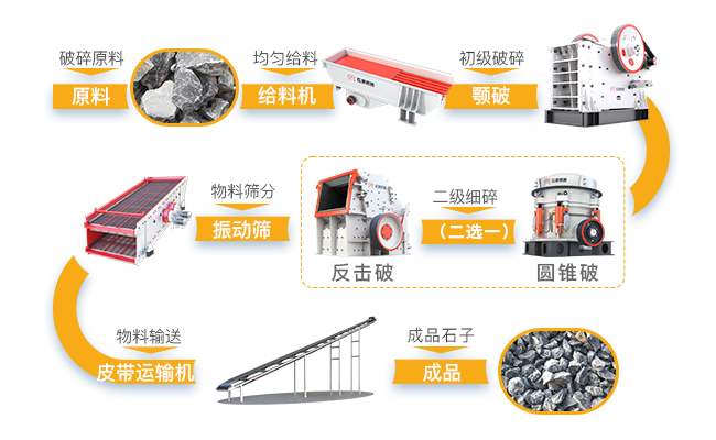 大塊石料經料倉由振動給料機均勻的送進顎式破碎機進行粗碎,粗碎后的石料由膠帶輸送機送到反擊破/圓錐破進行進一步破碎,細碎的石料由膠帶輸送機送到振動篩進行篩分,篩分出幾種不同規格的石子,滿足顆粒要求的石子,由成品膠帶輸送機送往成品料堆,不滿足顆粒要求的石子,由返料膠帶輸送機送到反擊破/圓錐破進行再次破碎,形成閉路多次循環,成品粒度可按照用戶的需求,進行組合和分級,可配置輔助的除塵設備,綠色環保。