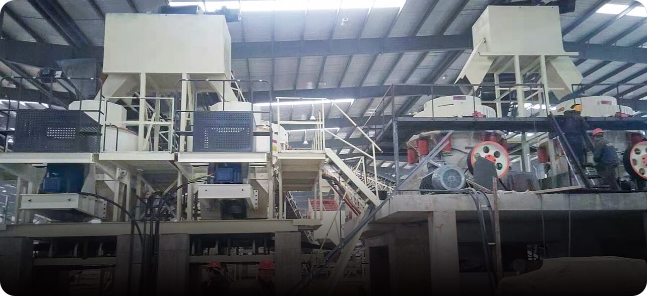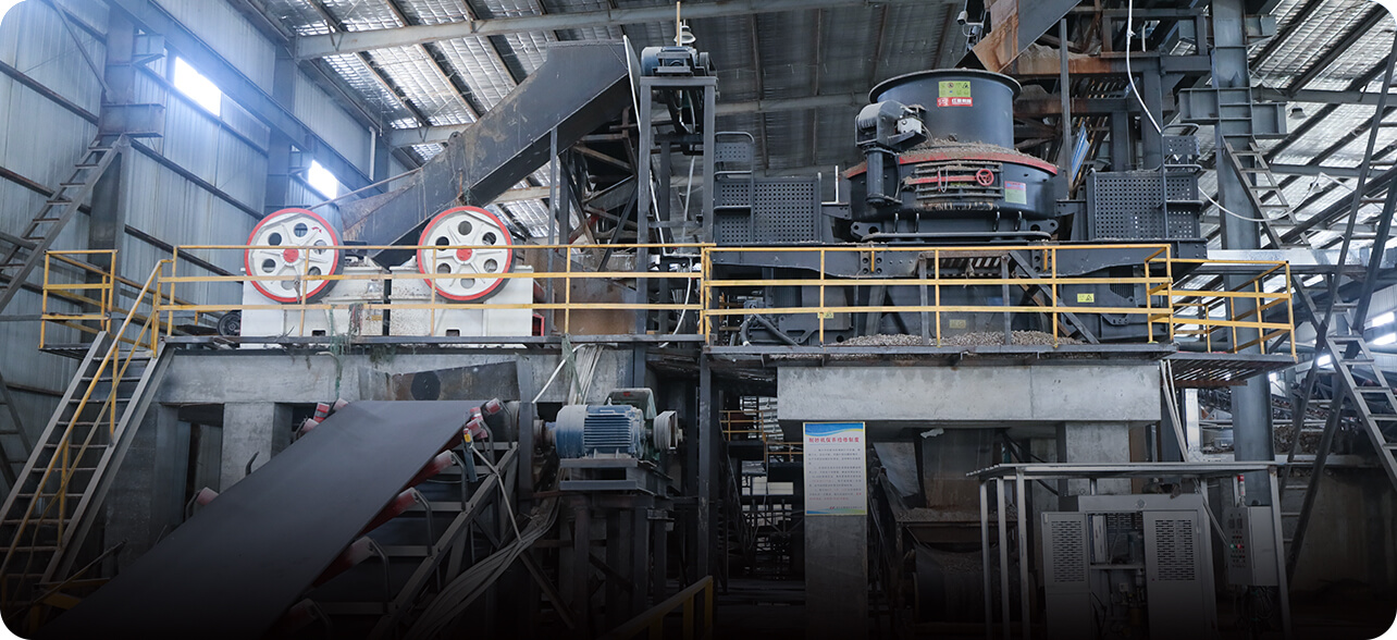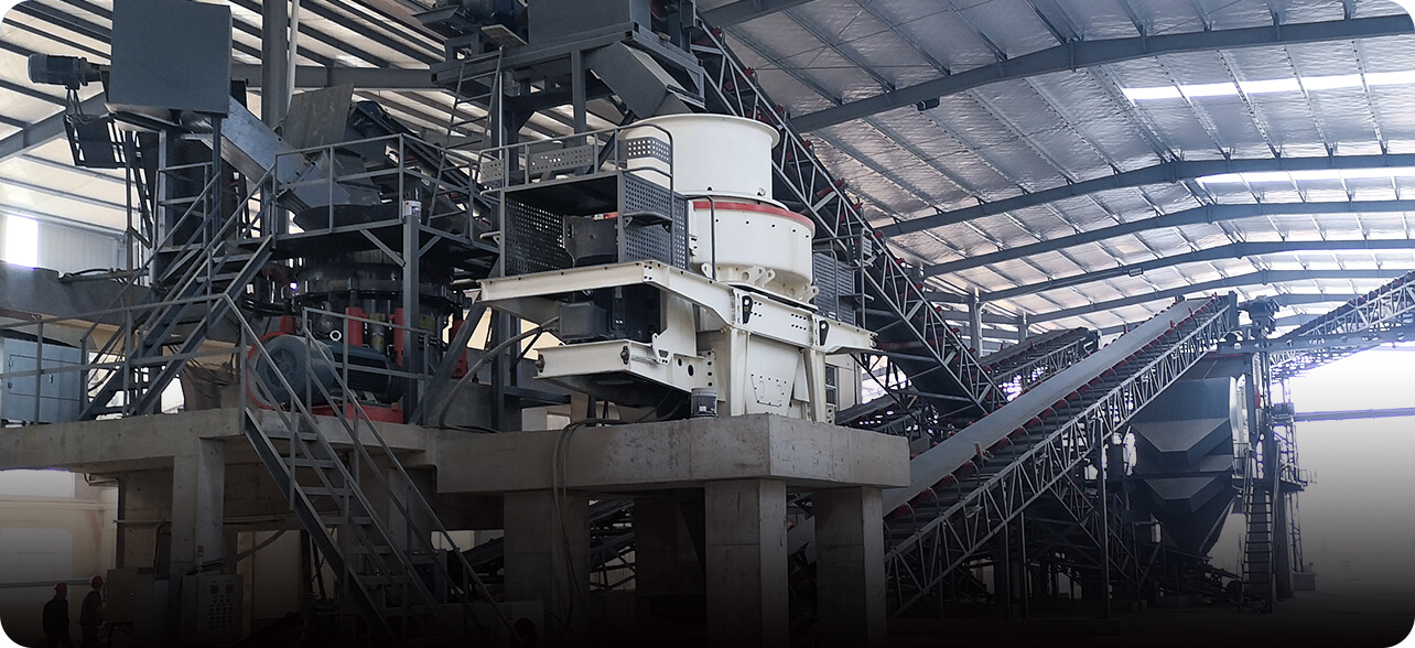 原料由料倉進(jìn)入振動(dòng)給料機(jī),再送入顎式破碎機(jī)進(jìn)行粗碎,粗碎后物料經(jīng)輸送機(jī)進(jìn)入反擊破或圓錐破進(jìn)行細(xì)碎,細(xì)碎后物料由輸送機(jī)送至振動(dòng)篩進(jìn)行篩選,不滿足制砂機(jī)進(jìn)料粒度的被返回反擊破或圓錐破中繼續(xù)破碎,滿足進(jìn)料粒度的物料被送入制砂機(jī)內(nèi)進(jìn)行制沙。從制砂機(jī)出來的細(xì)料,再次進(jìn)入振動(dòng)篩內(nèi)進(jìn)行篩分,篩分出滿足要求的砂子,進(jìn)入洗砂機(jī)清洗,清洗后由成品輸送帶輸送至成品堆;不滿足要求的砂石混合物料,送入制砂機(jī)進(jìn)行再次破碎。